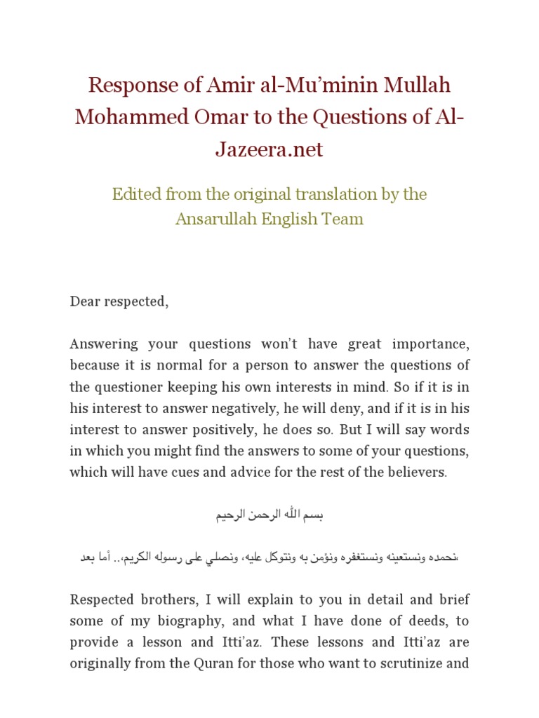 Response Of Amir Al Mu Minin Mullah Mohammed Omar To The Questions Of Al Jazeera Net Rtf Mohammed Omar Taliban
