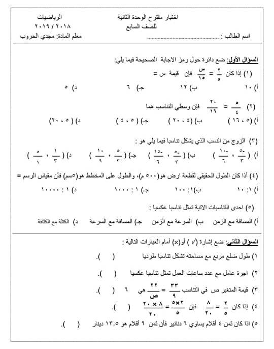 نموذج لاختبار الشهر الثاني الوحدة الثانية لمادة الرياضيات للصف السابع الفصل الأول منتديات صقر الجنوب