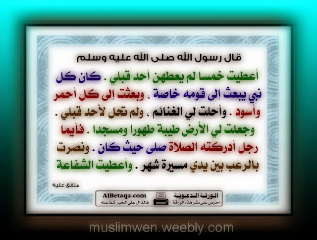 قال رسول الله صلي الله عليه وسلم اعطيت خمسا لم يعطهن احد قبلي مدونة نور القران الكريم