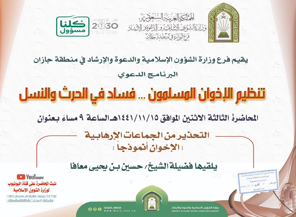 أسامة بن زيد المدخلي On Twitter أنتم على موعد مبارك الليلة مع فضيلة الشيخين الكريمين محمد بن زيد المدخلي وحسين بن يحيى معافا للاستماع لمحاضرتيهما في برنامج تنظيم الإخوان المسلمون فساد