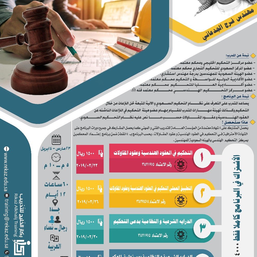 م فرج بن عبدالله الجدعاني On Twitter برنامج متخصص في التحكيم الهندسي يهدف البرنامج إلى إعداد محكمين مختصين في الفصل في النزاعات الناشئة عن العقود الهندسية وعقود المقاولات وكذلك تزويد المحكم بالدراية