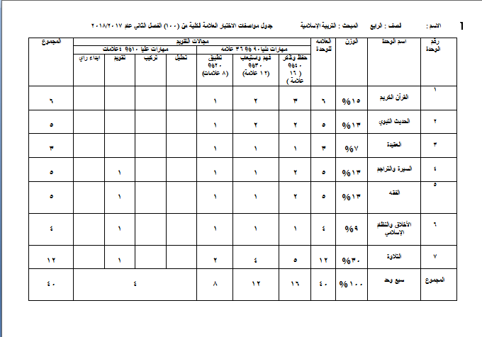نموذج Word جدول مواصفات الإختبار النهائي لمادة التربية الإسلامية الصف الخامس الفصل الثاني منتديات صقر الجنوب