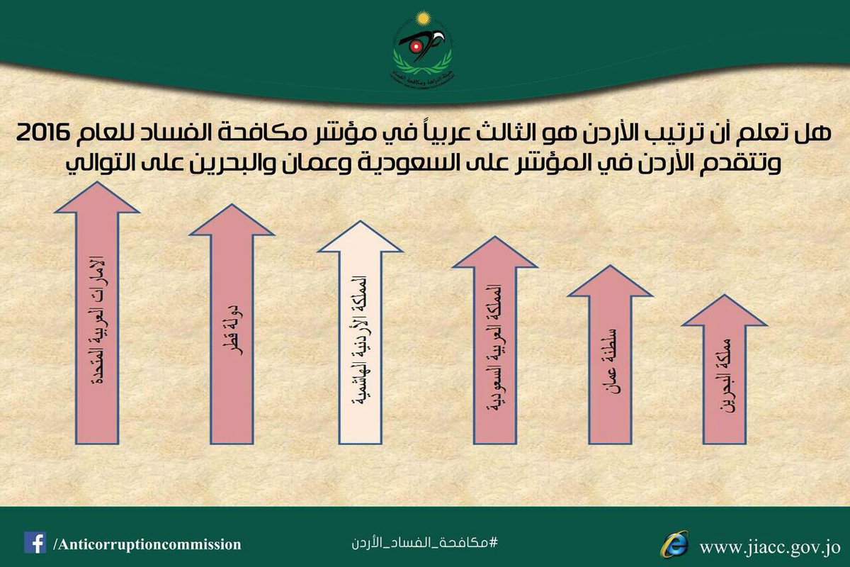 هيئة النزاهه و مكافحة الفساد En Twitter هل تعلم أن ترتيب الأردن هو الثالث عربيا في مؤشر مكافحة الفساد للعام 2016 مكافحة الفساد الاردن معلومة حب الاردن