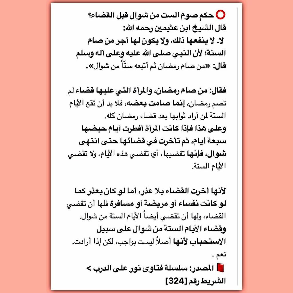 كبار علماء أهل السنة On Twitter حكم صوم الست من شوال قبل القضاء قال الشيخ ابن عثيمين لا لا ينفعها ذلك ولا يكون لها أجر من صام السنة لأن