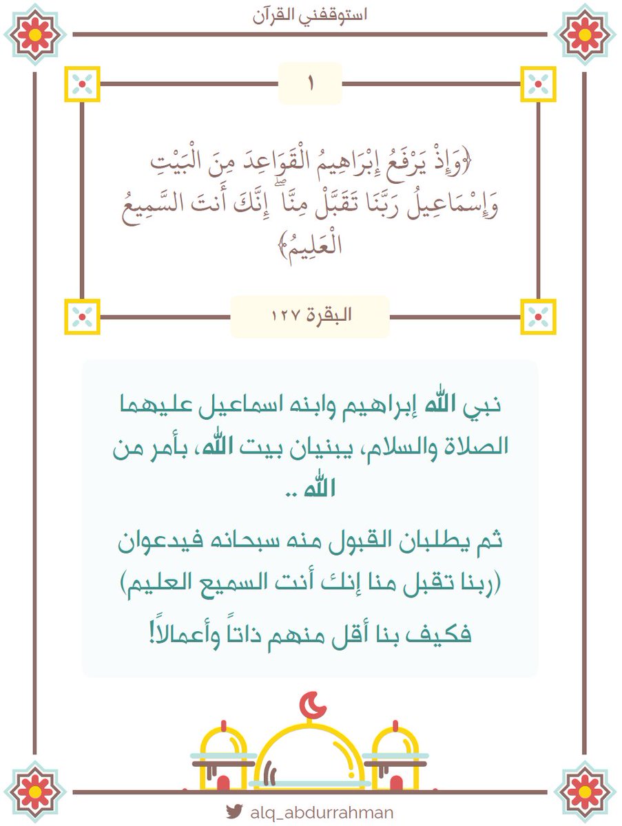 ارابيسك On Twitter من كتيب استوقفني القرآن آية من سورة البقرة و إ ذ ي ر ف ع إ ب ر اه يم ال ق و اع د م ن ال ب ي ت و إ س م اع يل ر ب ن ا ت ق ب ل م ن ا إ ن ك أ نت الس م يع ال ع ل يم من Alq Abdurrahman ساعة استجابة