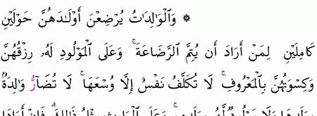 و ال و ال د ات ي ر ض ع ن أ و ل اد ه ن ح و ل ي ن ك ام ل ي ن ل م ن أ ر اد أ ن ي ت م الر ض اع ة و ع ل ى ال م و ل ود ل ه ر ز ق ه ن و ك س و ت ه ن ب ال م ع ر وف ل ا ت ك ل ف ن ف س إ ل ا و س ع ه ا ل ا ت ض ار و ال د ة ب و ل د ه ا