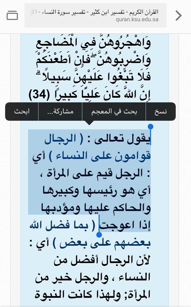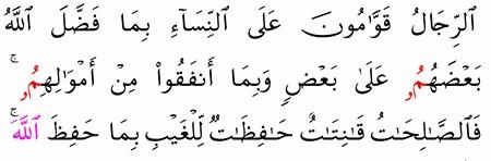 الر ج ال ق و ام ون ع ل ى الن س اء ب م ا ف ض ل الل ه ب ع ض ه م ع ل ى ب ع ض و ب م ا أ ن ف ق وا م ن أ م و ال ه م ف الص ال ح ات ق ان ت ات ح اف ظ ات ل ل غ ي ب ب م ا ح ف ظ الل ه و الل ات ي ت خ اف ون ن ش وز ه ن ف ع ظ وه ن