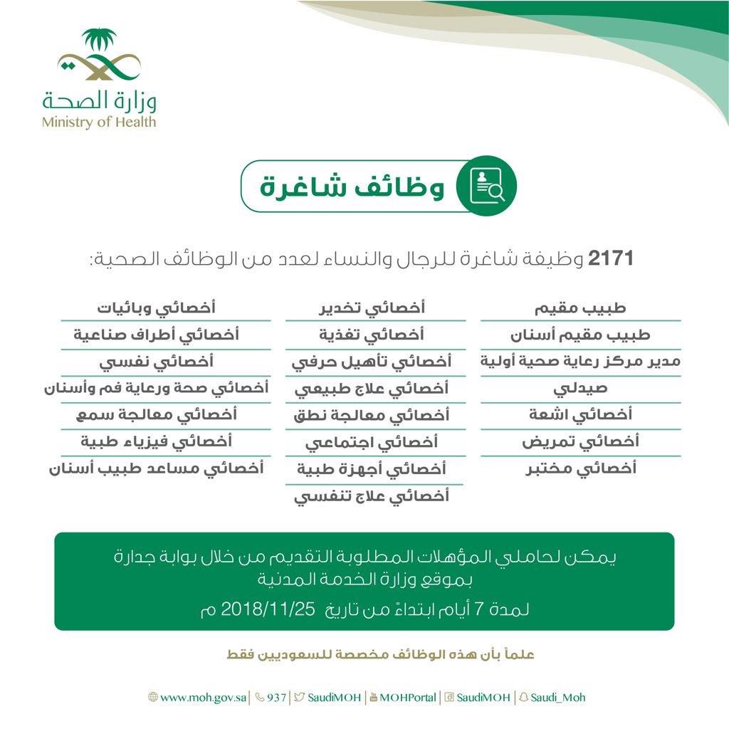 وظائف للسعوديين On Twitter وزارة الصحة بالتعاون مع وزارة الخدمة المدنية تعلن عن 2171 وظيفة صحية للسعوديين والسعوديات فقط والتقديم على الوظائف يبدأ غد ا الأحد الموافق 2018 11 25م عبر بوابة جدارة من