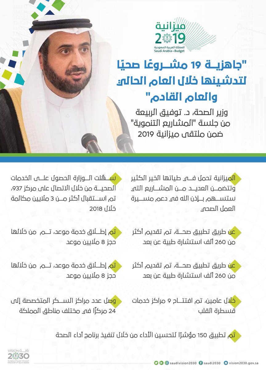 رؤية السعودية 2030 Sur Twitter وزير الصحة توفيق الربيعة جاهزية 19 مشروع ا صحي ا لتدشينها خلال العام الحالي والعام القادم رؤية السعودية 2030 ميزانية السعودية 2019 Https T Co Gd4vskmgre