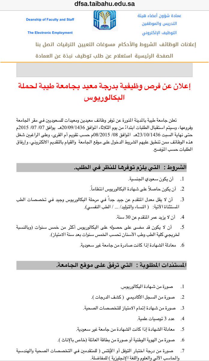 وظائف عربية السعودية وظائف أكاديمية شاغرة بجامعة طيبة بالمدينة المنورة للعام الدراسي 1435 1436 هـ