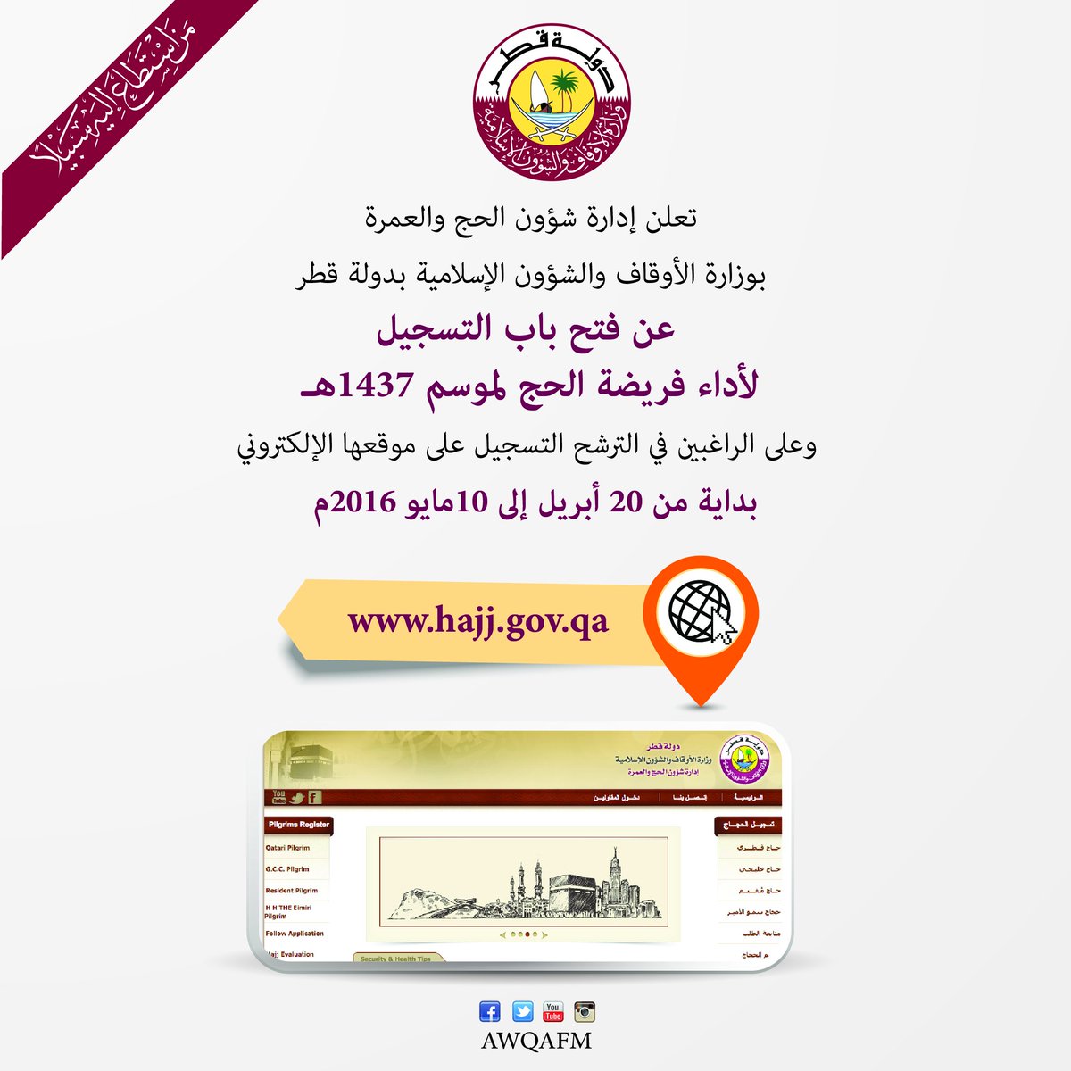 O Xrhsths وزارة الأوقاف قطر Sto Twitter تعلن إدارة شؤون الحج و العمرة بوزارة الأوقاف عن فتح باب التسجيل لأداء فريضة الحج لموسم 1437 وأذن في الناس Https T Co Hcyz9gfmth