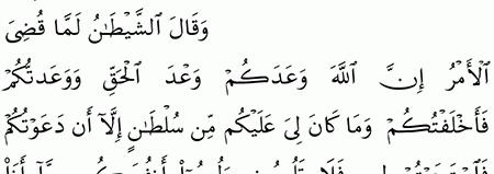 و ق ال الش ي ط ان ل م ا ق ض ي ال أ م ر إ ن الل ه و ع د ك م و ع د ال ح ق و و ع د ت ك م ف أ خ ل ف ت ك م و م ا ك ان ل ي ع ل ي ك م م ن س ل ط ان إ ل ا أ ن د ع و ت ك م ف اس ت ج ب ت م ل ي ف ل ا ت ل وم ون ي و ل وم وا أ ن ف س ك م م ا